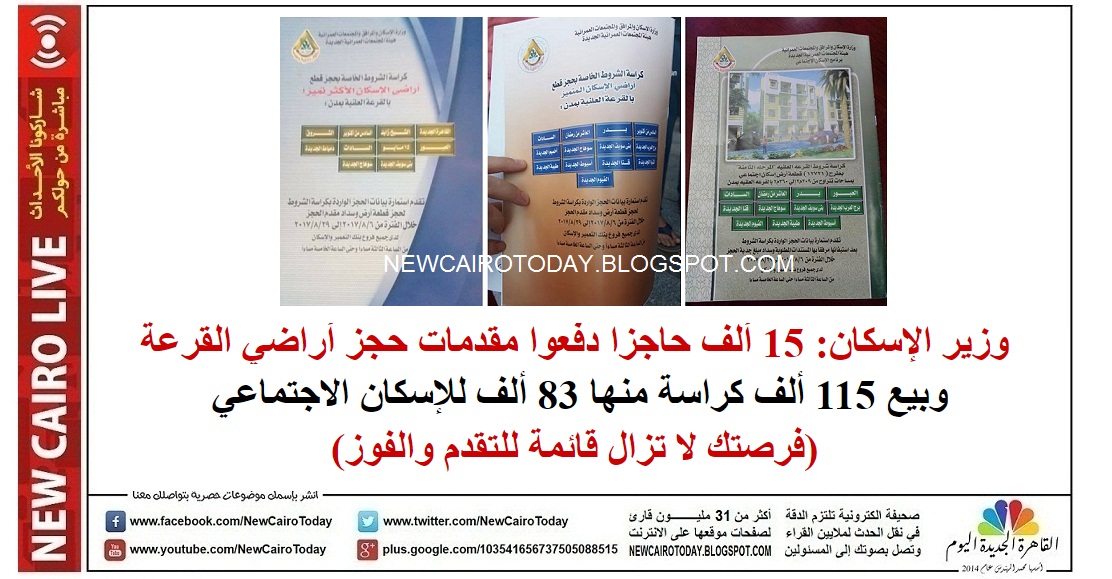 موعد طرح اراضى وزارة الاسكان 2017. و59 قطعة بنظام السعر المعلن و14قطعة بالمظاريف المغلقة مساحات متنوعة للأراضى المطروحة من 4أفدنة وحتى 2800فدان. وبدأت وزارة الاسكان في تسليم شقق الاسكان الاجتماعي الكراسة الزرقاء والكراسة الحمراء 2016 خلال الاسابيع الحالية بينما سيتم تسليم شقق الاعلان التاسع 2017 بعد 6 اشهر من الان وخلال. موعد تسليم شقق الاسكان الاجتماعي 2017 2018. أعلنت وزارة الإسكان والمرافق والمجتمعات العمرانية طرح أراض بطريقة تخصيص جديدة بالإسناد بالأمر المباشر.