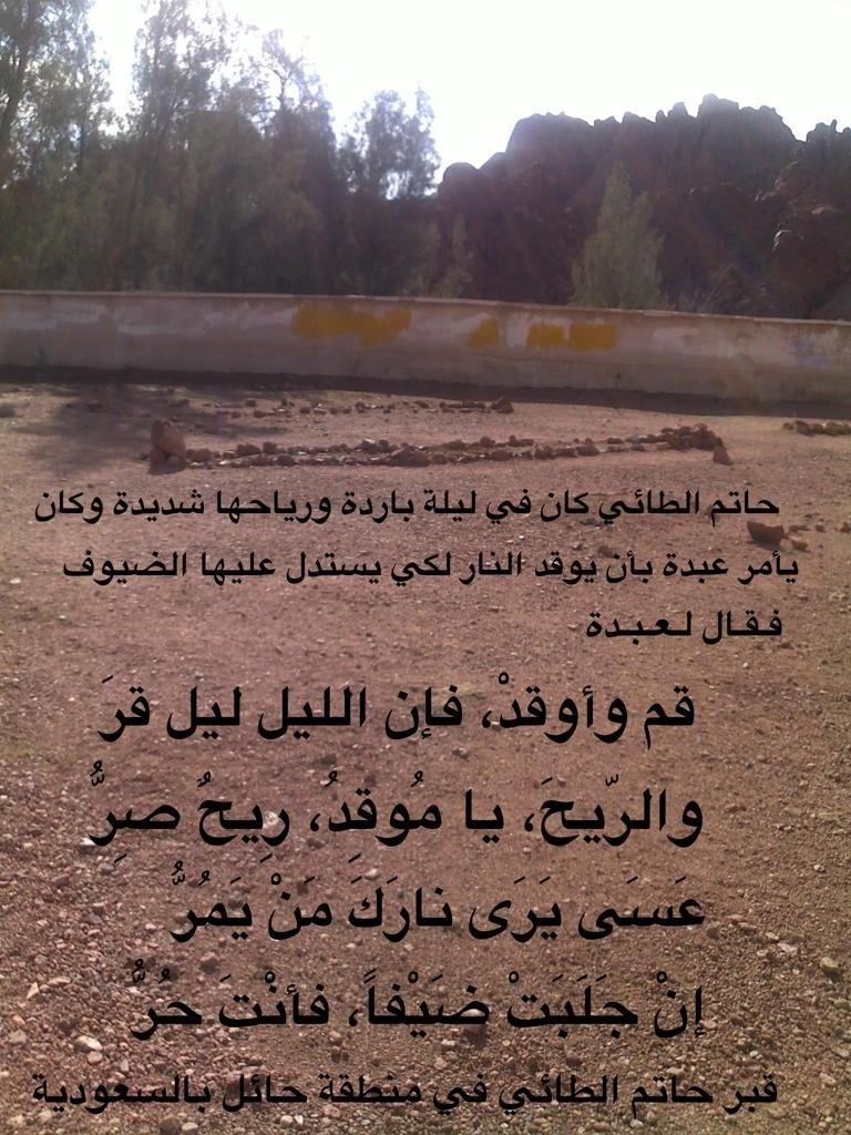 كان لحاتم الطائي موقد النار فوق جبل وسط حائل السمراء حيث كان يقول لعبده. يعتز أهل حائل بجدهم حاتم الطائي رمز الكرم على مدى التاريخ العربي حيث كان الأجداد القدماء يوقدون النار ليستدل الضيوف إلى خيامهم من أجل إيوائهم. الليل يا غلام ليل قر والريح يا موقد فيها صر فأجج النار لمن يمر إن جلبت ضيفا فأنت حر. فارس جواد يضرب المثل بجوده كان من.