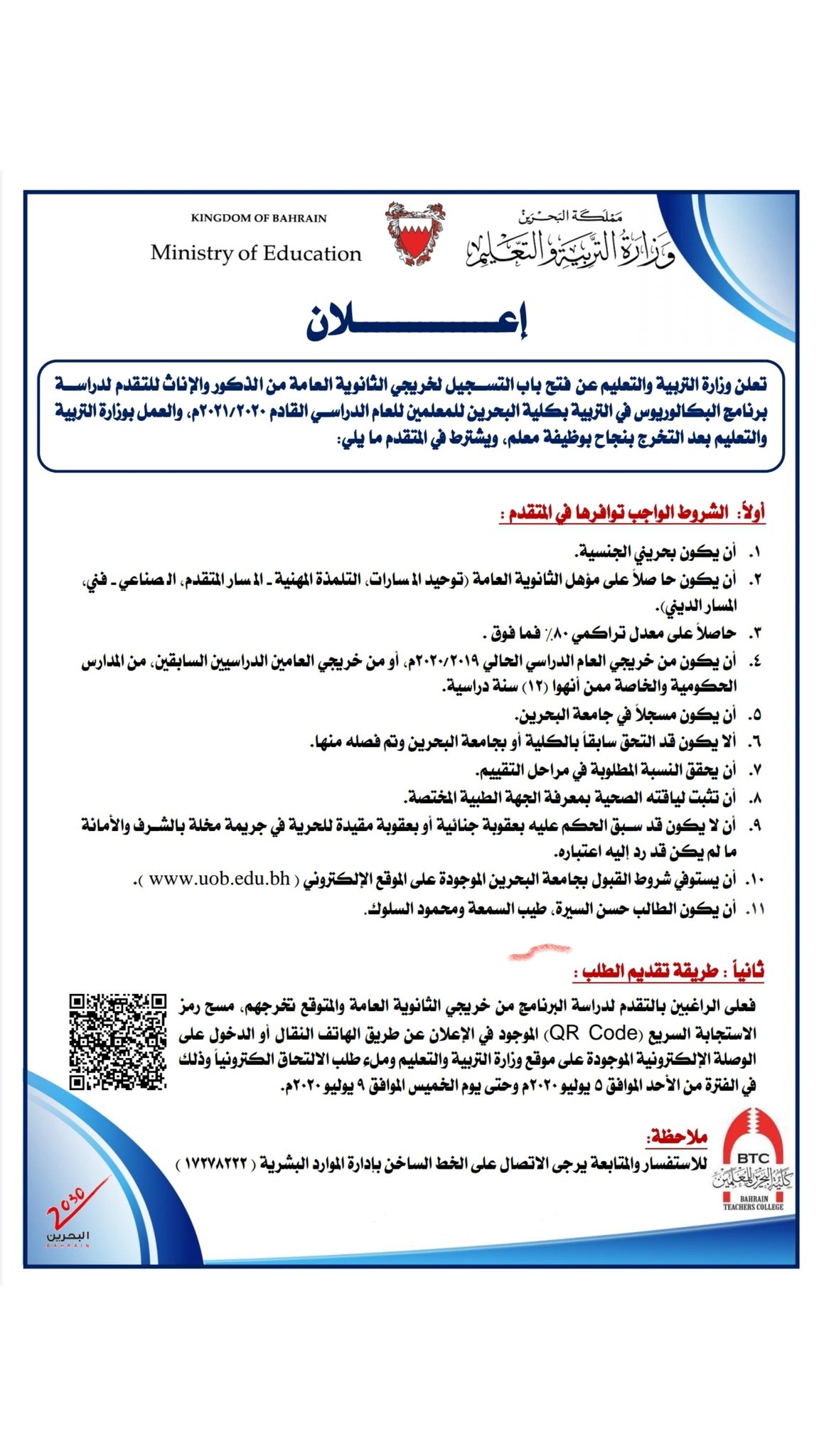 Moebahrain Pa Twitter تعلن وزارة التربية والتعليم عن فتح باب التسجيل لخريجي الثانوية العامة من الذكور والإناث للتقدم لدراسة برنامج البكالوريوس في التربية بكلية البحرين للمعلمين للعام الدراسي القادم 2020 2021م Https T Co T5s5ljko6j