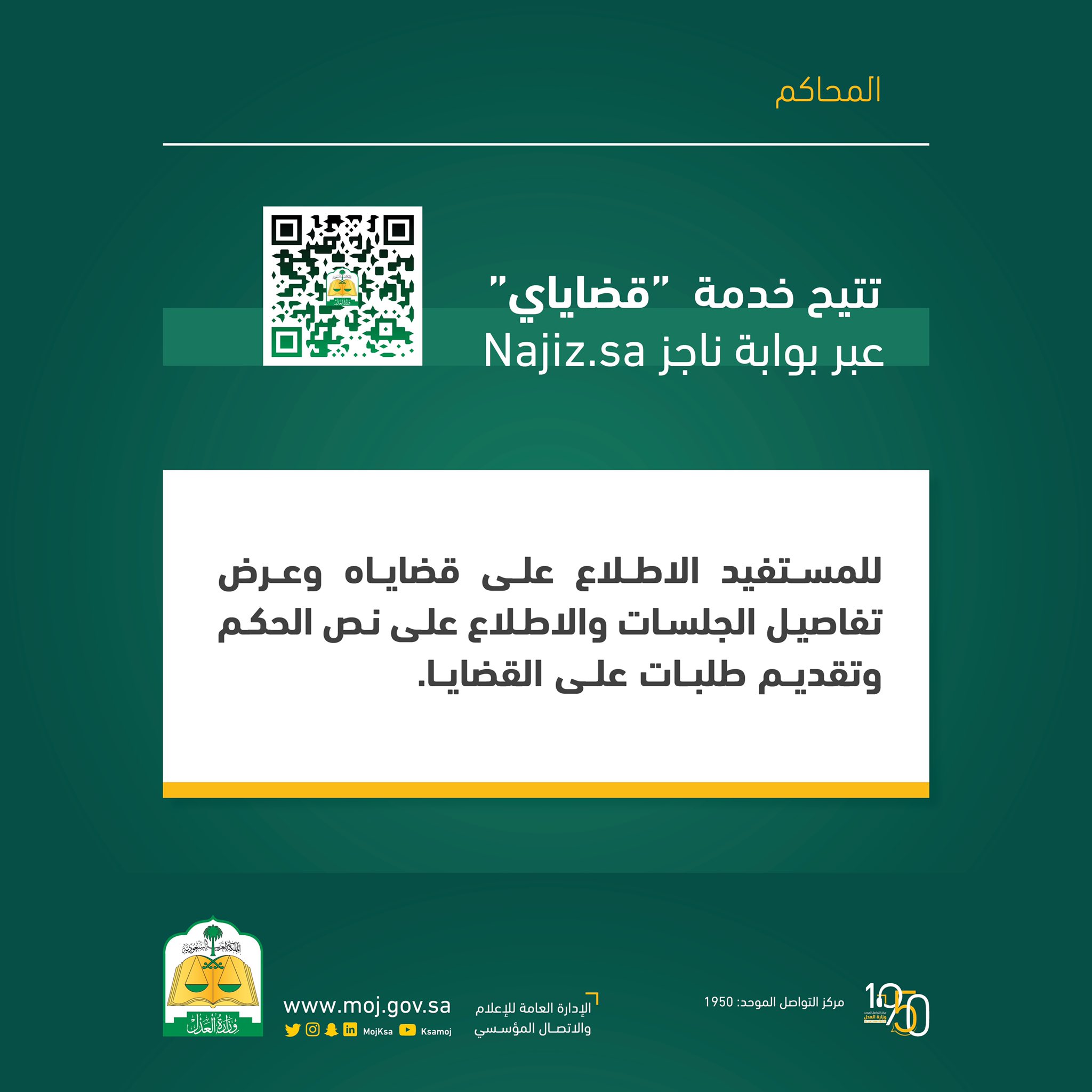 ناجز الطلبات على القضايا. حيث تنقسم الطلبات على القضايا التي تتم عن طريق ناجز للمحاكم إلى نوعين. قضاياي هي خدمة تتيح للمستفيد من الاطلاع على قضاياه مع امكانية عرض تفاصيل الجلسات والاطلاع على نص الحكم وتقديم طلبات على القضايا. الطلبات على القضايا ناجز المحاكم الاستعلام عن موعد قضية تقديم طلب للدوائر الإنهائية نشر بيانات التنفيذ الاستعلام عن مقدمي خدمات التنفيذ المعتمدين. الطلبات على القضايا ناجز المحاكم الاستعلام عن موعد قضية تقديم طلب للدوائر الإنهائية نشر بيانات التنفيذ الاستعلام عن مقدمي خدمات التنفيذ المعتمدين.