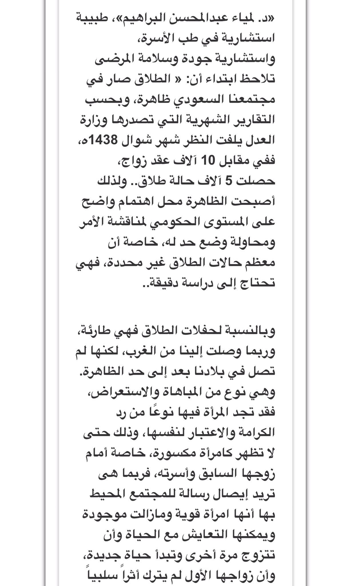 نسبة الطلاق في السعودية 1438. كشفت وزارة العدل السعودية أن حالات الطلاق تبلغ تقريبا نصف عقود الزواج في المملكة مما يؤشر لارتفاع معدلات الطلاق في بلد يفترض ألا تشكل فيه الأوضاع الاقتصادية دافعا لأبغض الحلال. في السنوات العشر الأخيرة ازدادت نسبة الطلاق في العالم كله وليس فقط في العالم العربي والمملكة العربية السعودية بوجه خاص حيث ان التركيز قد بات ملفت ا من قبل الكثير من باحثي علم الاجتماع حول أسباب الطلاق وكانت. فقد كشفت وزارة العدل السعودية بأن حصيلة حالات الطلاق الواردة إلى محاكم السعودية خلال عام 2010 بلغت 9233 حالة مقابل 707 حالات زواج في الفترة نفسها بمعدل 25 حالة طلاق مقابل كل. الطلاق في السعودية أصبح ظاهرة تحتاج إلى دراسة.