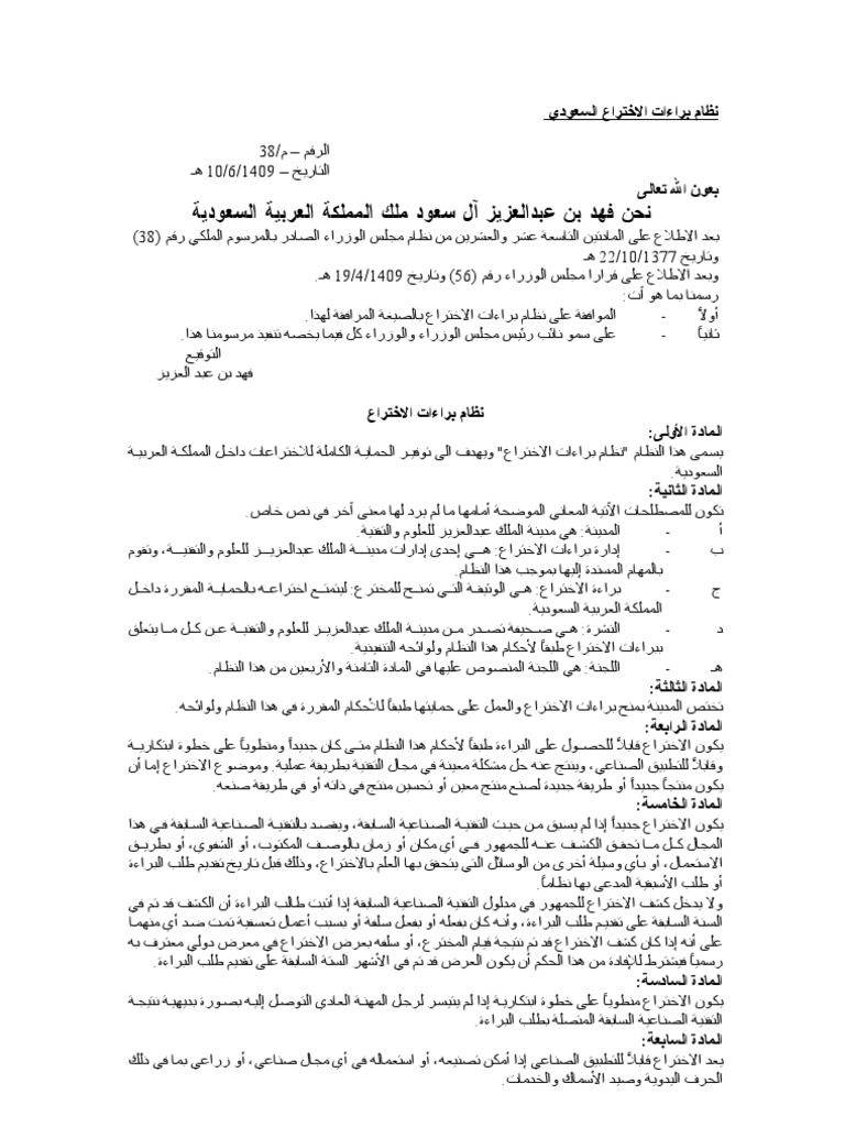 حيث إنها تقوم بربط القدرة أو الكفاءة الأكاديمية للجامعة بإنشاء الثروة ولذلك نحن في حاجة ماسة إلى إنشاء مكاتب نقل التكنولوجيا الجامعية في كل جامعة في السعودية من أجل مساعدة. 3 تقديم وصف. 2 أ يكون تاريخ الايداع لطلب براءة الاختراع هو تاريخ استلام الطلب مستوفيا على الاقل ما يلي. قانون براءات الاختراع السعودي الرقم م 38 التاريخ 10 6 1409 هـ بعون الله تعالى نحن فهد بن عبدالعزيز آل سعود ملك المملكة العربية السعودية بعد الاطلاع على المادتي.