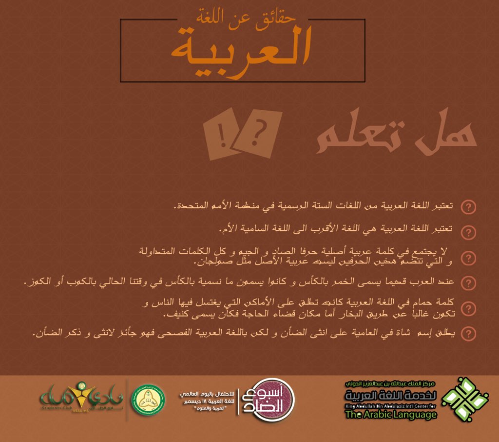 بمناسبة اليوم العالمي للغة العربية ويصادف 18 ديسمبر اليكم حقائق ومعلومات قد لا تعرفونها عن اللغة العربية.