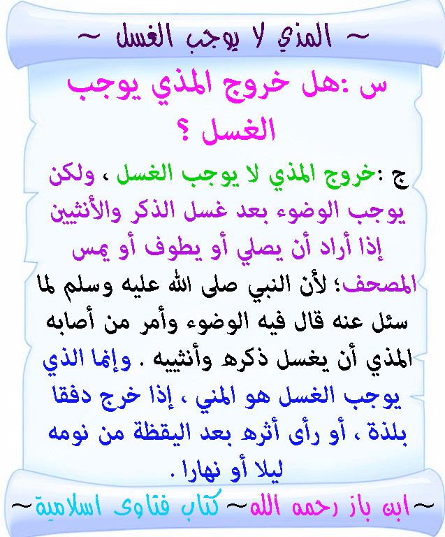 هل خروج المذي يبطل الوضوء. كنت رجل ا مذ اء وكنت أستحي ي أن أسأل النبي صل ى الله عليه وسل م ل مكان ابن ت ه فأمرت الم قداد بن الأسود. الأصل أن خروج الريح ينقض الوضوء لكن إذا كان يخرج من شخص باستمرار وجب عليه أن يتوضأ لكل صلاة عند إرادة الصلاة ثم إذا خرج منه وهو في الصلاة لا يبطلها وعليه أن يستمر في صلاته حتى يتمها تيسرا من الله تعالى لعباده. خروج المذي لا يبطل الصوم في أصح قولي العلماء سواء كان ذلك بسبب تقبيل الزوجة أو مشاهدة بعض الأفلام أو غير ذلك مما يثير الشهوة ولكن لا يجوز لمسلم مشاهدة الأفلام الخليعة ولا استماع ما حرم الله من الأغاني. هل يبطل الوضوء تقبيل الزوجة.