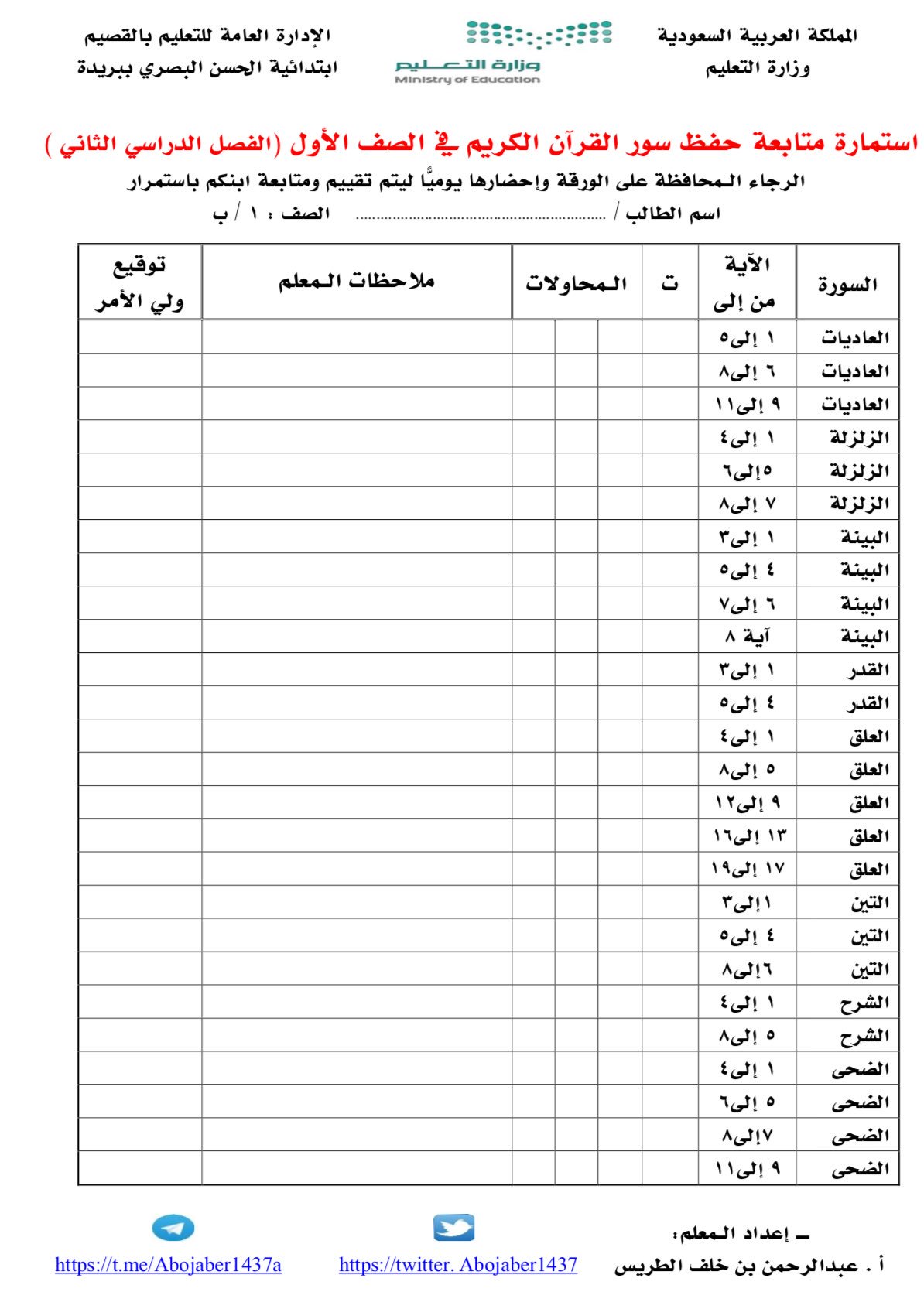 ورقة متابعة القران الكريم للصف الثالث 1441. تحميل ورقة متابعة القران للصف الثالث الابتدائي ف1. سورة التحريم سورة. من خلال الصورة فانه يمكن الحصول على. استمارة قرآن للصف الثالث الابتدائي الفصل الثاني ف2 1440 pdf عرض مباشر بدون تحميل على موقع كتبي اونلاين سجل متابعة الطالب لحفظ منهج القران الكريم ثالث ابتدائي الفصل الدراسي الثاني ١٤٤٠ تلاوة مراجعة.