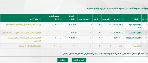 وزارة العدل تقسيم الميراث. مركز الخدمة والمعلومات في وزارة العدل. خدمة إلكترونية تقدمها وزارة العدل توفر برنامجا إلكترونيا لحساب الميراث الشرعي لكل وارث ونسبته ومقدار حصته مع توضيح موجز لحالة كل وارث ونصيبه الشرعي كما تبين الخدمة المحجوبين من الورثة. الموقع يساعد على تقسيم التركة أذا كانت أموال ولكنك تعلم ان التركة ربما تكون عقارات وغيرها ويصعب تقسيمها عن طريق. تقسيم التركة يمكن الاكتفاء بتوقيع أحد الورثة فقط على طلب تسجيل الميراث أو اتفاقية تقسيم.