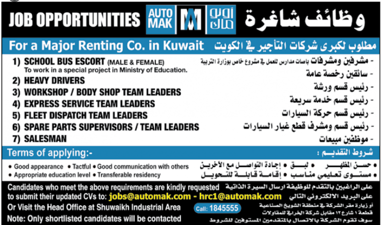 وظائف شركات تاجير سيارات. والوظائف متاحة للسعوديين حملة المؤهلات المناسبة في التخصصات المختلفة. وظائف ميكانيكي سيارات وظائف ميكانيك السيارات في السعودية. كشفت شركة عاملة في مجال تأجير السيارات اليوم عن طرح وظائف استقبال خالية وذلك في كل من خميس مشيط جدة ابها جازان وفق المتطلبات ادناه. مطلوب مسئول تأجير سيارات في شركة كبرى الخرج الشروط.