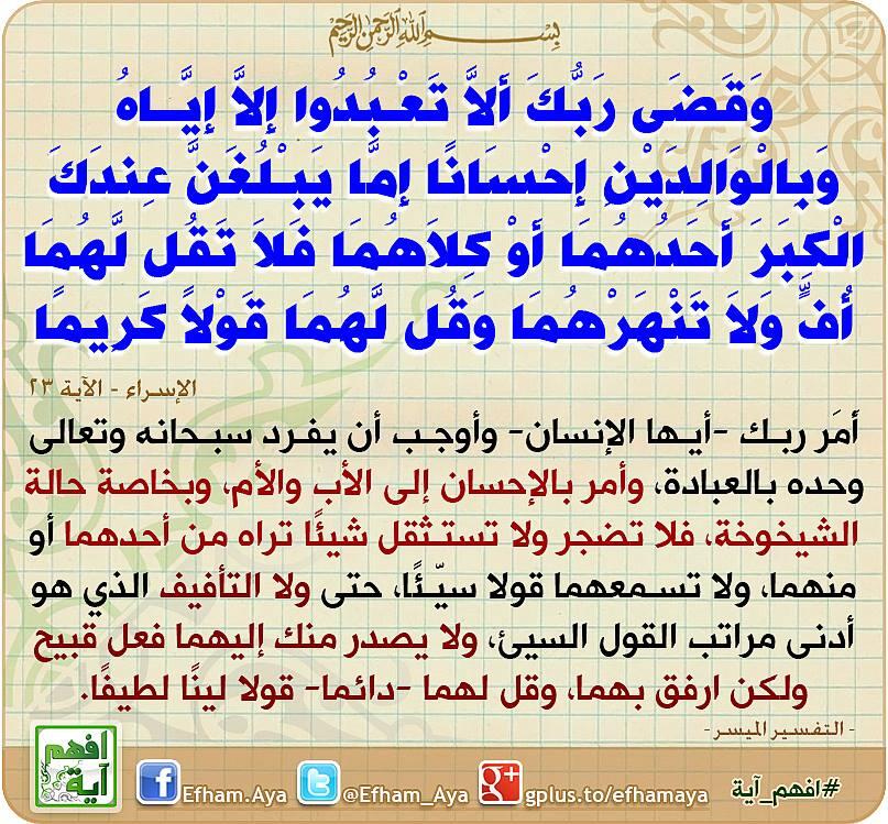 افهم آية على تويتر وقضى ربك ألا تعبدوا إلا إياه وبالوالدين إحسانا إما يبلغن عندك الكبر أحدهما أو كلاهما فلا تقل لهما أف افهم آية Http T Co 7tsfsoy7hd