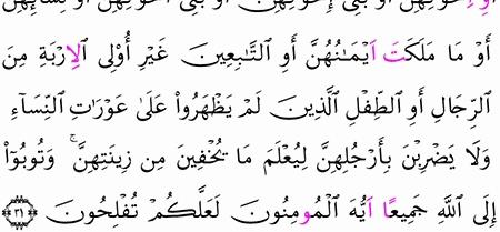 ولا يضربن بأرجلهن ليعلم ما يخفين من زينتهن. قال الله تعالى قل للمؤمنين يغضوا من أبصارهم ويحفظوا فروجهم ذلك أزكى لهم إن الله خبير بما يصنعون وقل للمؤمنات يغضضن من أبصارهن ويحفظن فروجهن ولا يبدن زينتهن إلا ما ظهر منها. ولا يضربن بأرجلهن ليعلم ما يخفين من زينتهن كانت المرأة في الجاهلية إذا كانت تمشي في الطريق وفي رجلها خلخال صامت لا يسمع صوته ضربت برجلها الأرض فيعلم الرجال طنينه فنهى الله المؤمنات عن مثل ذلك.