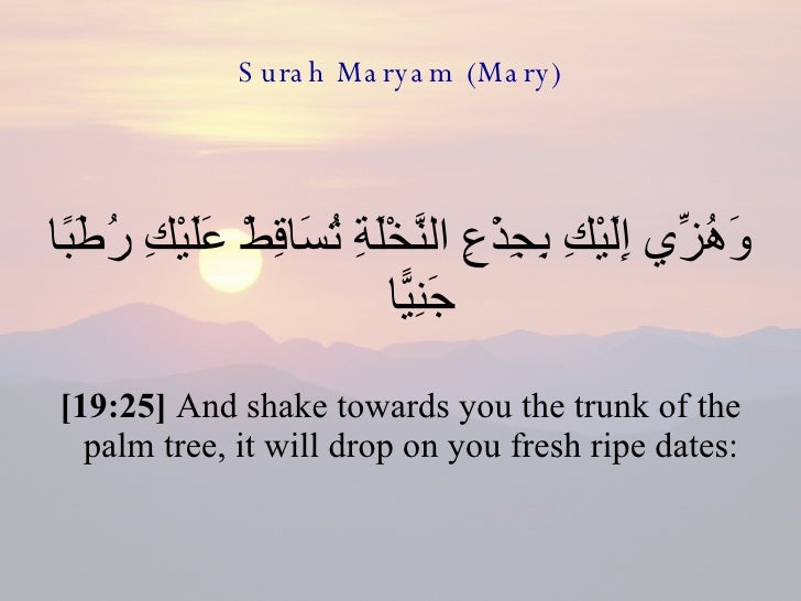 وهزي اليك بجذع النخلة بالانجليزي. 15 أي فليمدد سببا. و ه ز ي إ ل ي ك ب ج ذ ع الن خ ل ة لقد أمر الله تعالى سيدتنا مريم أثناء حملها بالمسيح بعدة أوامر والعجيب أن العلم جاء ليثبت صدق هذه التعاليم الإلهية وفوائدها الطبية للجنين والأم. بجذع زائدة مؤكدة كما يقال. وهزي إليك بجذع النخلة يتساقط رطبا وجنيا.